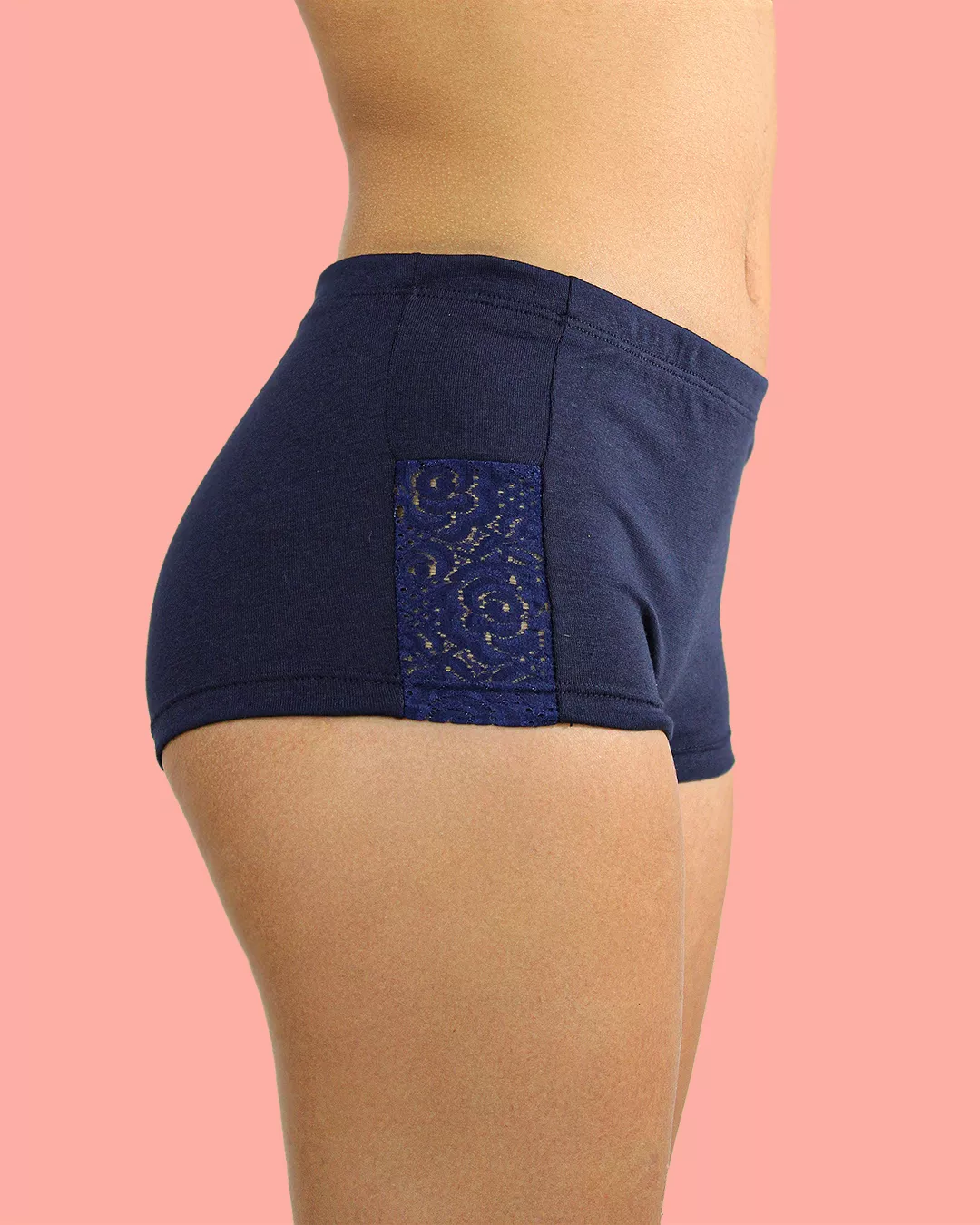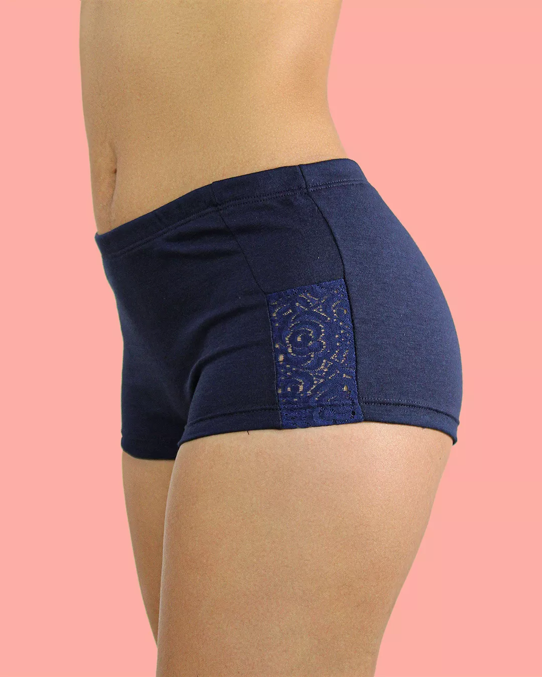 Cachetero en algodón azul con apliques de encaje lateral. Suave, fresco y elegante, ideal para el uso diario o momentos especiales. Resalta tus curvas con comodidad y un toque sofisticado. ¡Un básico imprescindible!