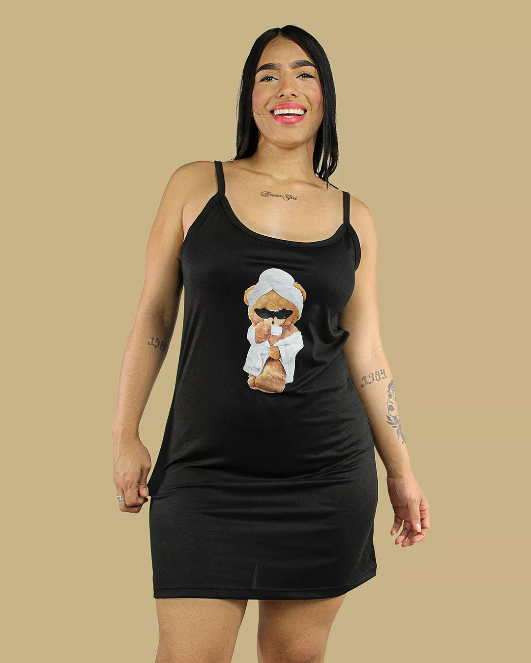 La Pijama Batola Negra Aplique Oso combina estilo y comodidad en una prenda ideal para descansar. Fabricada en suave piel de durazno, presenta un encantador aplique de oso con gafas y bata. Su color negro le da un toque elegante, mientras que el corte de tirantes finos ofrece un ajuste cómodo y favorecedor. Disponible en tallas S, M, L y XL, es perfecta para dormir o relajarte en casa con total frescura.