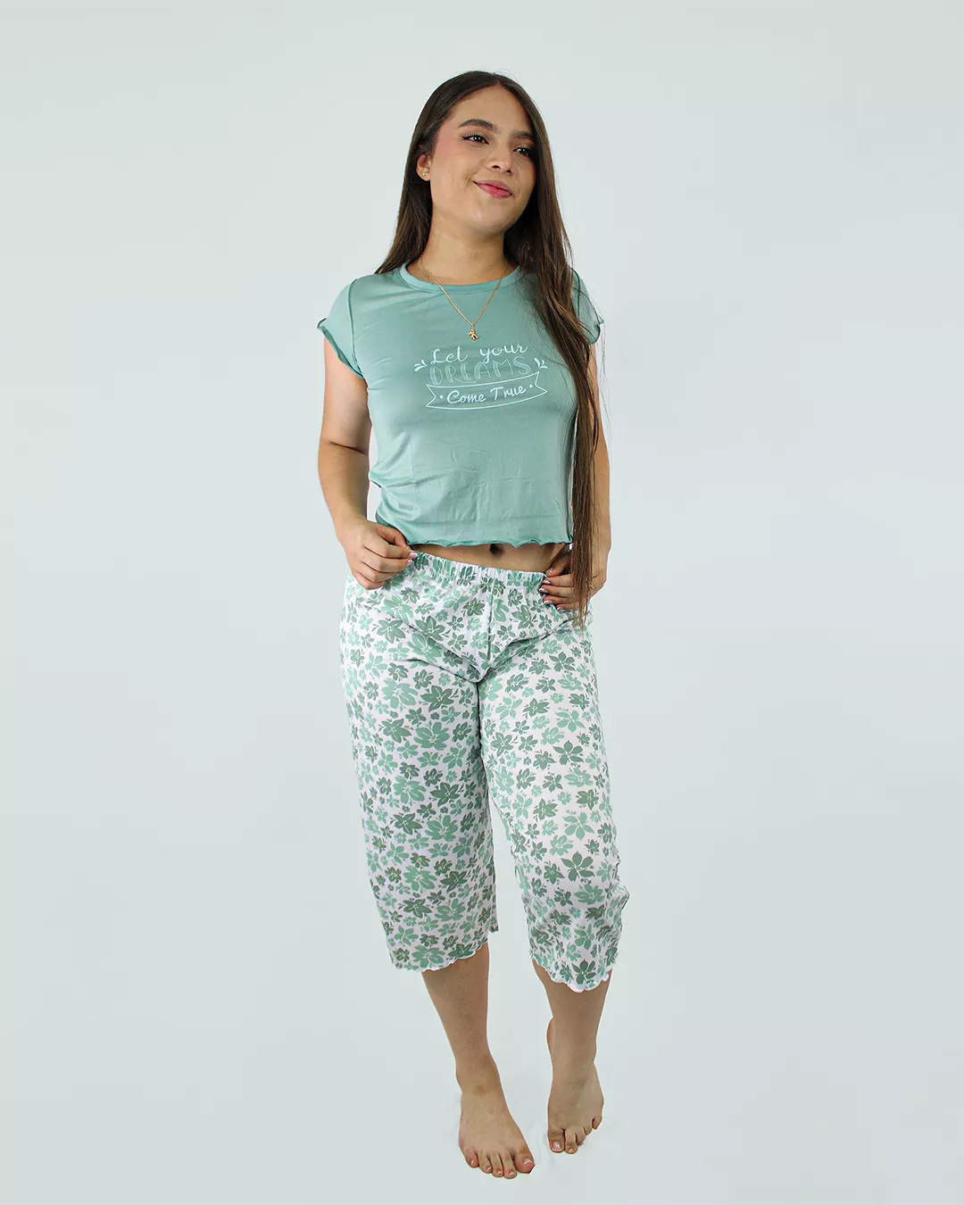 Conéctate con la calma y el estilo del color de moda: el Verde Oliva. Nuestra Pijama Capri Calma presenta un diseño inspirador con el mensaje “Let your Dreams Come True” y un moderno borde ondulado que marca la diferencia. Fabricada con la suavidad inigualable de la Piel de Durazno, es la pieza que tus clientas más fashionistas estarán buscando. ¡Un éxito garantizado para tu negocio!