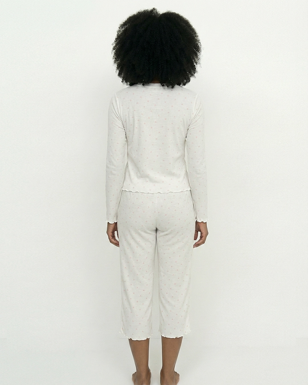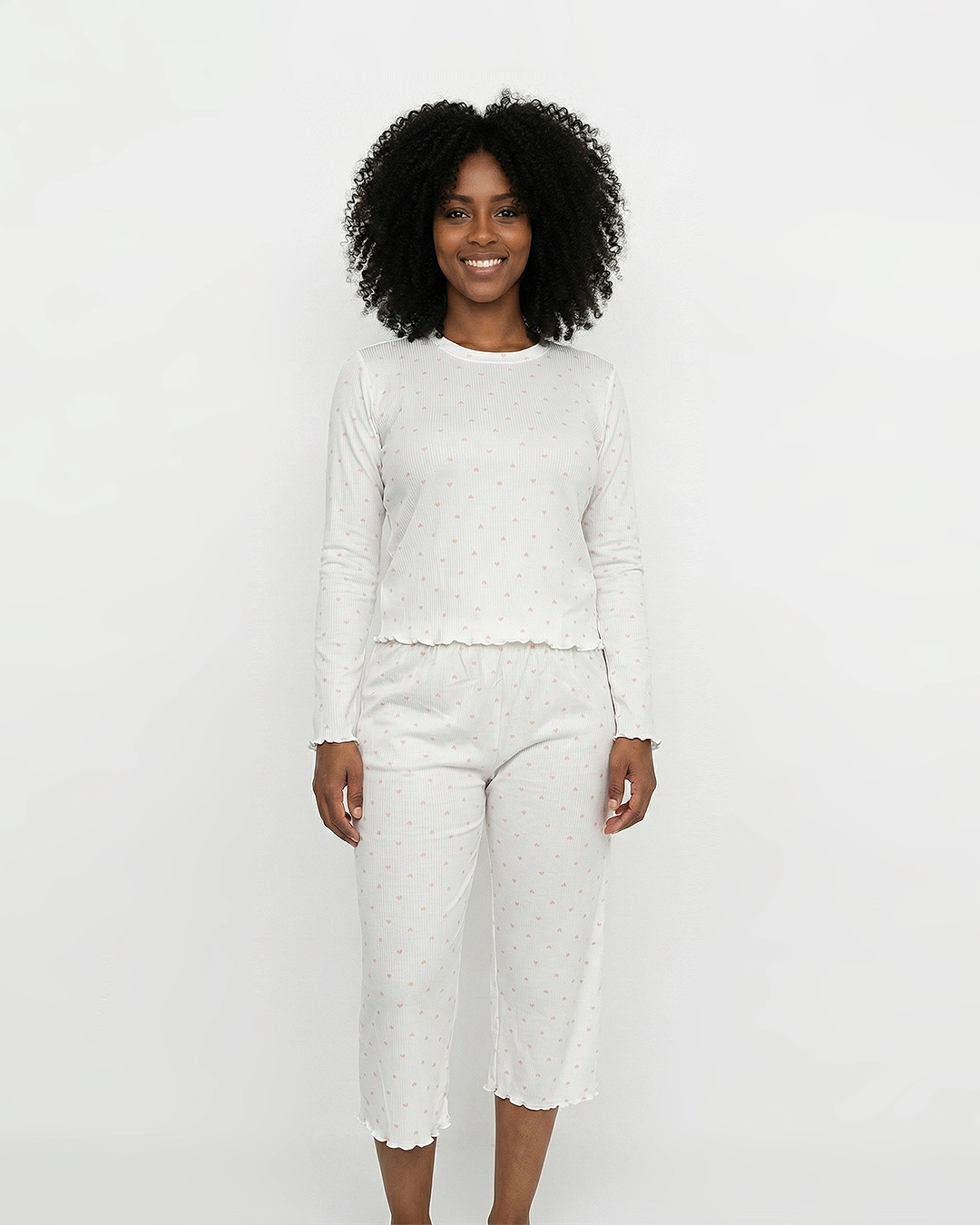 El diseño es dulce y minimalista: un fondo blanco puro salpicado por un delicado estampado de pequeños corazones en tono rosa. El conjunto consta de una camiseta de manga larga y un pantalón tipo pescador (capri), ideal para climas medios. Los detalles que marcan la diferencia son sus bordes ondulados (tipo lechuga) en los puños, el ruedo de la blusa y la bota del pantalón, aportando un toque femenino, juvenil y muy en tendencia.