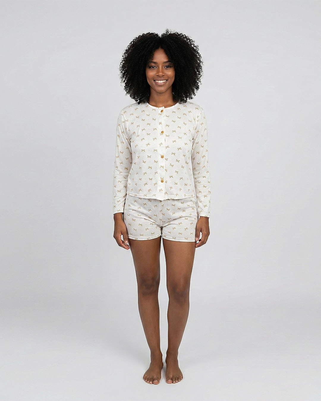El diseño de dos piezas incluye una camiseta de manga larga estilo cárdigan, con una práctica abotonadura frontal de botones en tono madera que aportan un toque rústico y chic. El short a juego permite total libertad de movimiento. Sobre un sofisticado fondo beige crema, destaca un delicado estampado de pequeños lazos (moños) dorados, siguiendo la tendencia coquette de forma sutil y refinada. Es una prenda que te hará sentir arreglada y cómoda al instante.
